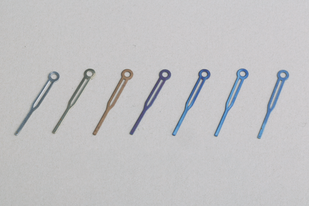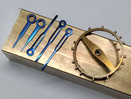 Aluminium (at the lower end) or brass (at the mid-to-high end) is used for the base material before being coated in another substance such as nickel for a silver-look, or chemically treated to give a ‘blued’ look. Each hand is stamped out of a long thin sheet of brass or aluminium using a die (a cookie cutter!) and a hydraulic press. This process cuts the hand out, curves it if required, and creates a hole. Around this opening the material forms into a very shallow tube which attaches to the hands by friction to the respective hour/minute/second pipe from the movement.