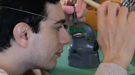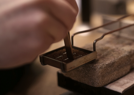 To create thermally blued hands, we need to use a particular type of high-carbon steel. Whilst brass is a relatively malleable metal, steel is not, and so it won’t press-fit onto the movement. To get around this we make the hands in steel and then create a ‘pipe’ for each one out of brass. These pipes are tiny, especially for the second hand, and each needs to be fixed to the steel hand before it’s affixed to the movement. To do this the pipe is made on a lathe with a miniscule chamfer in the top so that when it’s placed inside the steel hole in the hand it deforms evenly when struck with a hammer. Now that the pipe and hand are one, they can be attached to the watch.