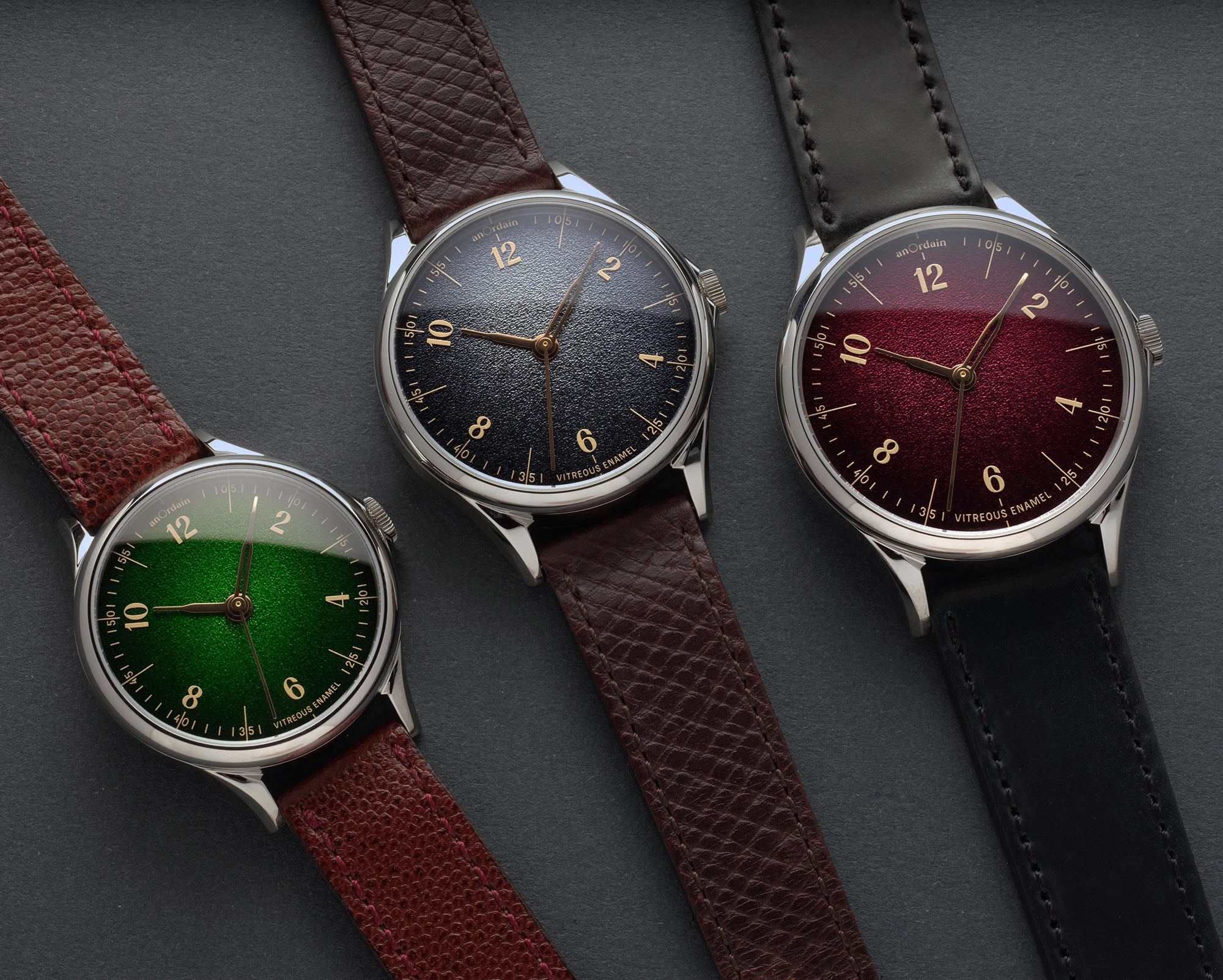 Our take on a dress watch, the Model 1 is the design that introduced anOrdain to the world. A showcase for our hand-crafted dials, it is available in three sizes with a selection of transparent and opaque enamels.