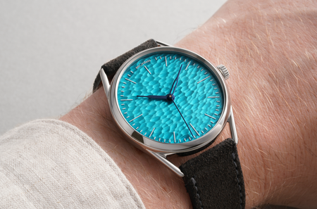 The 3D model of the texture is scaled down and engraved into a die, which is then used to individually hand-stamp each silver dial blank.