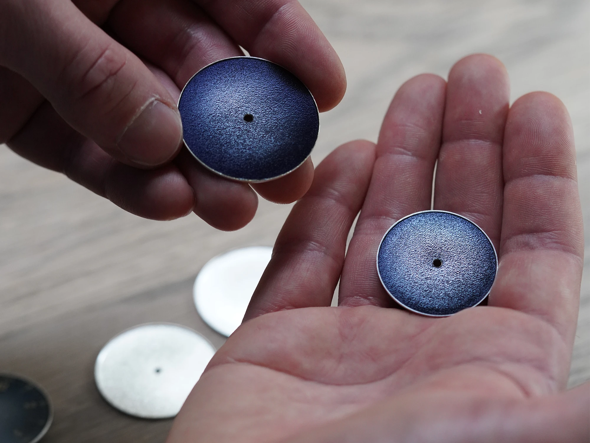 The silver dial blank is stamped to have a domed top, which allows the enamel to have greater depth – and therefore depth of colour –  around the outer edge. We developed the technique after noticing a gradient effect in a dial that had accidentally been warped in the kiln.
