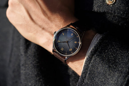 Our watchmakers applied themselves to master the craft of heat tempering steel. The hands are individually polished, then carefully heat-treated to an even and consistent straw-coloured finish.