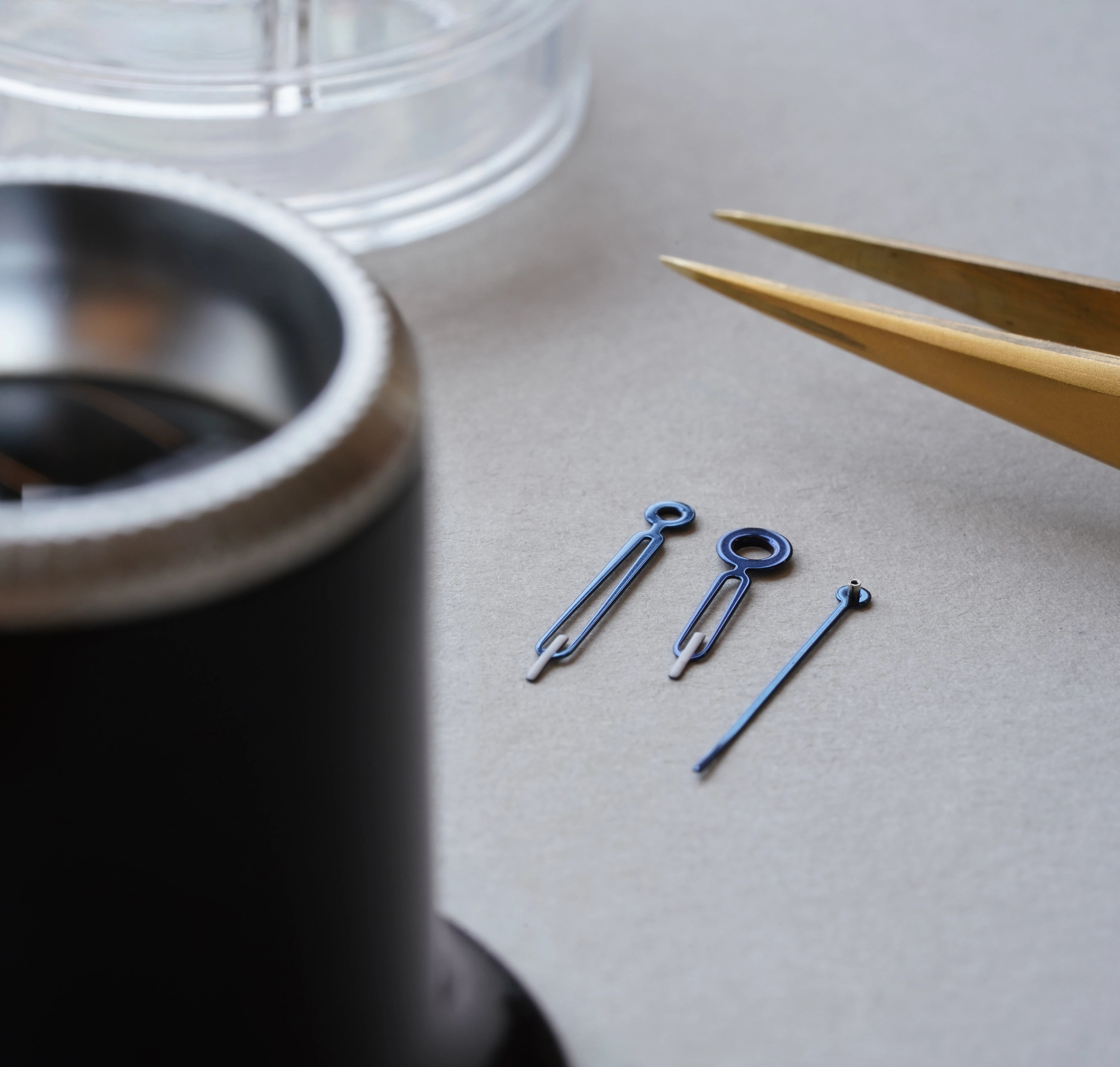 An evolution of syringe-style hands, with a lume tip inspired by the way a hand holds a pen. Individually polished, then carefully heat-treated to create an even and consistent blue.