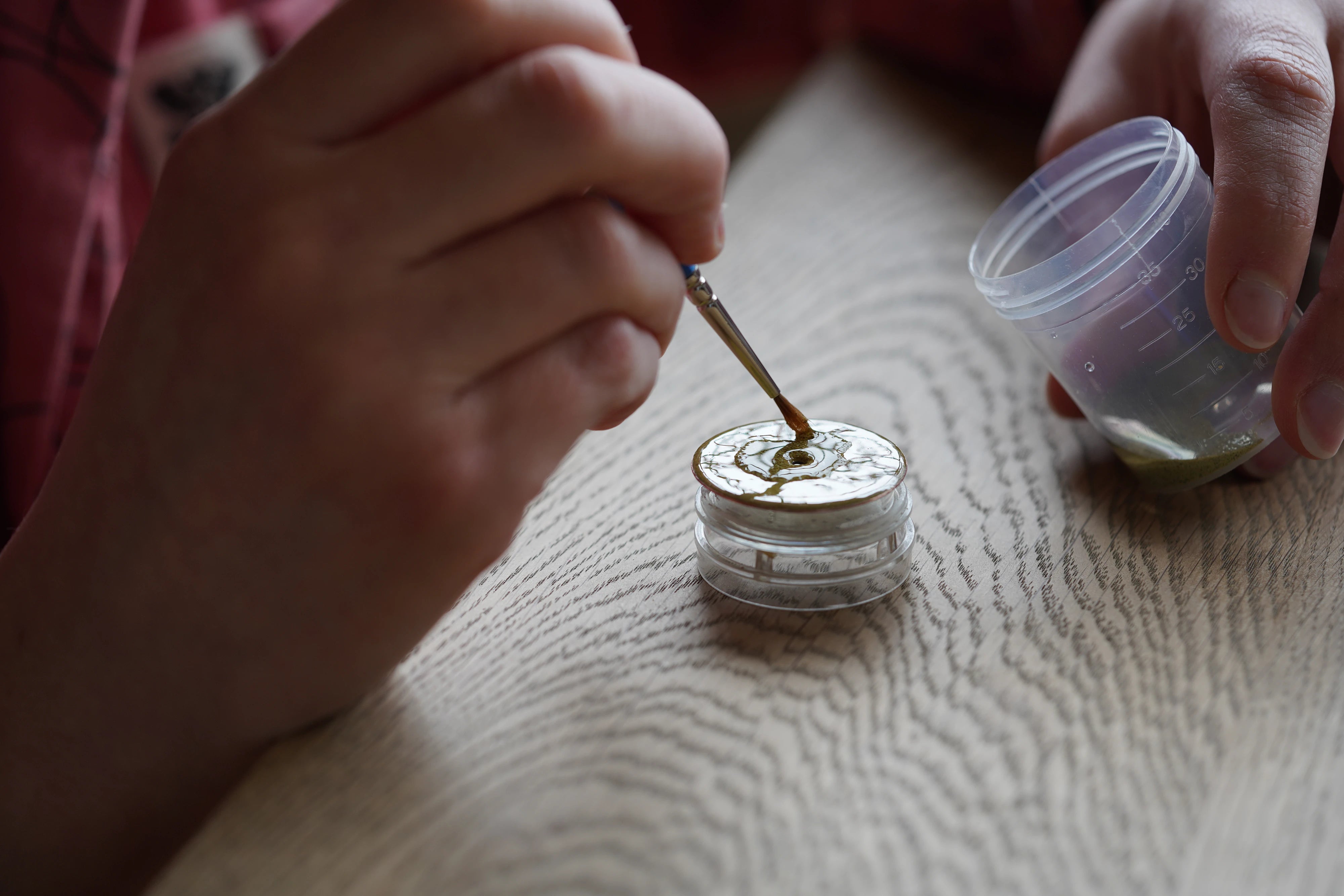 Different shades of enamel are achieved by blending a fine balance of elements. These react uniquely with the silver dial blanks that we use, giving each one its own appearance and texture. In the case of the Model 2 Flax, the result is a speckled, organic finish.
