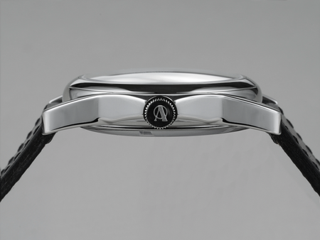 The curved case is shaped comfortably to the wrist, available in 36mm and 39.5mm options, and has a crown guard added for added protection.